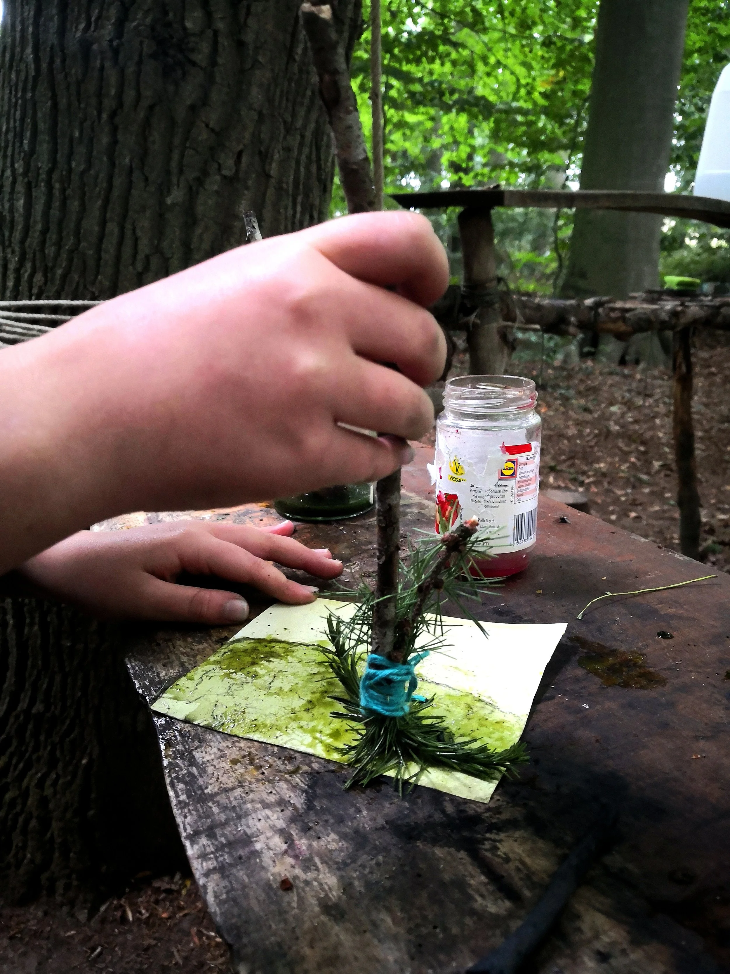 Aus den gesammelten Pflanzen stellten wir acht verschiedene Farbtöne her. Mit selbstgemachten Pinseln, Federn oder den Fingern malten wir auf Aquarellpapier.