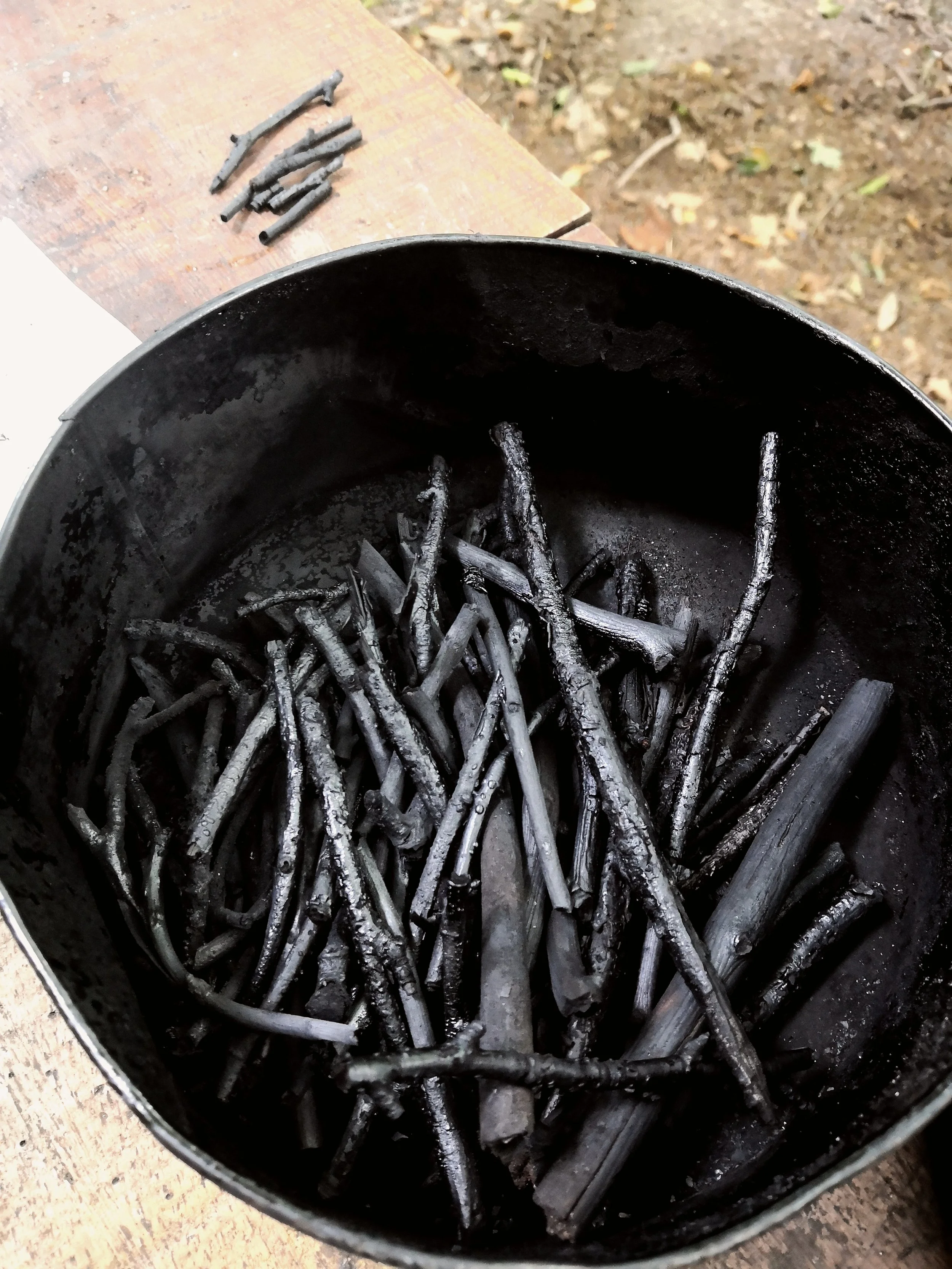 Neben den Farben aus Pflanzen stellten wir Zeichenkohel aus Ästen her. Dazu wurden verschiedene Hözchen in einer Metalldose gesammelt. Danach legten wir die Dose für 15 Minuten in die Glut des Lagerfeuers. Schon war die feinste Zeichenkohle fertig.